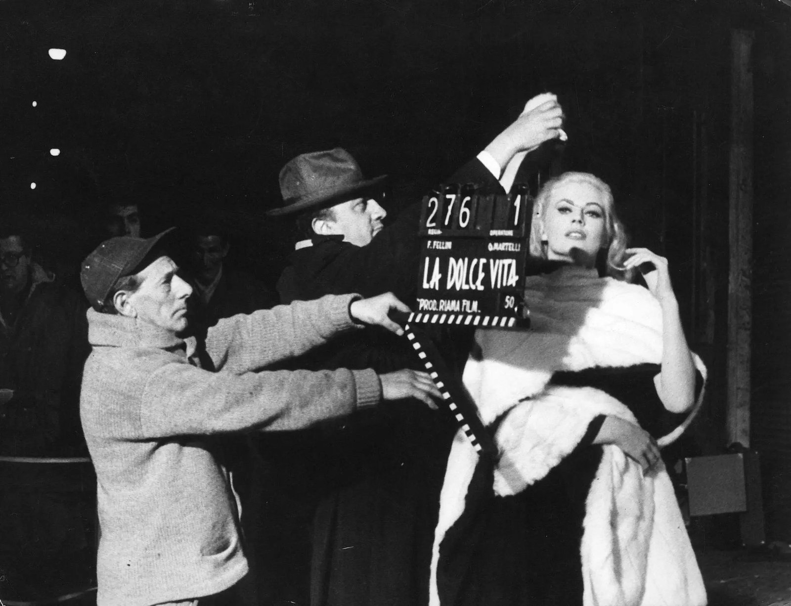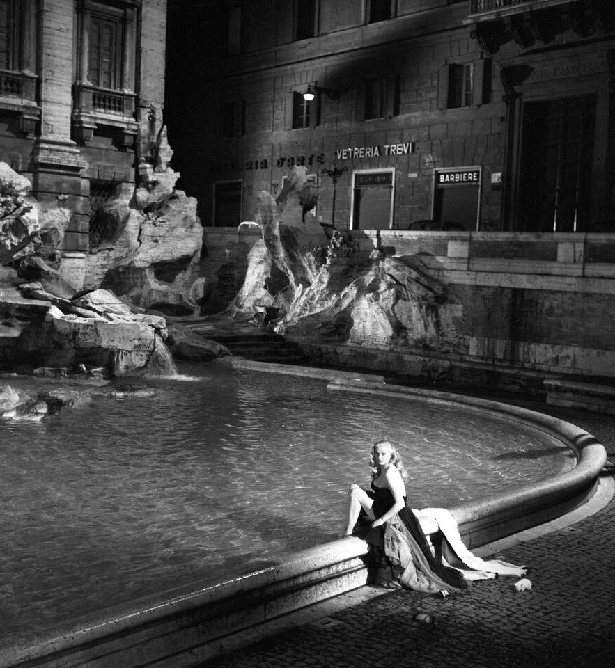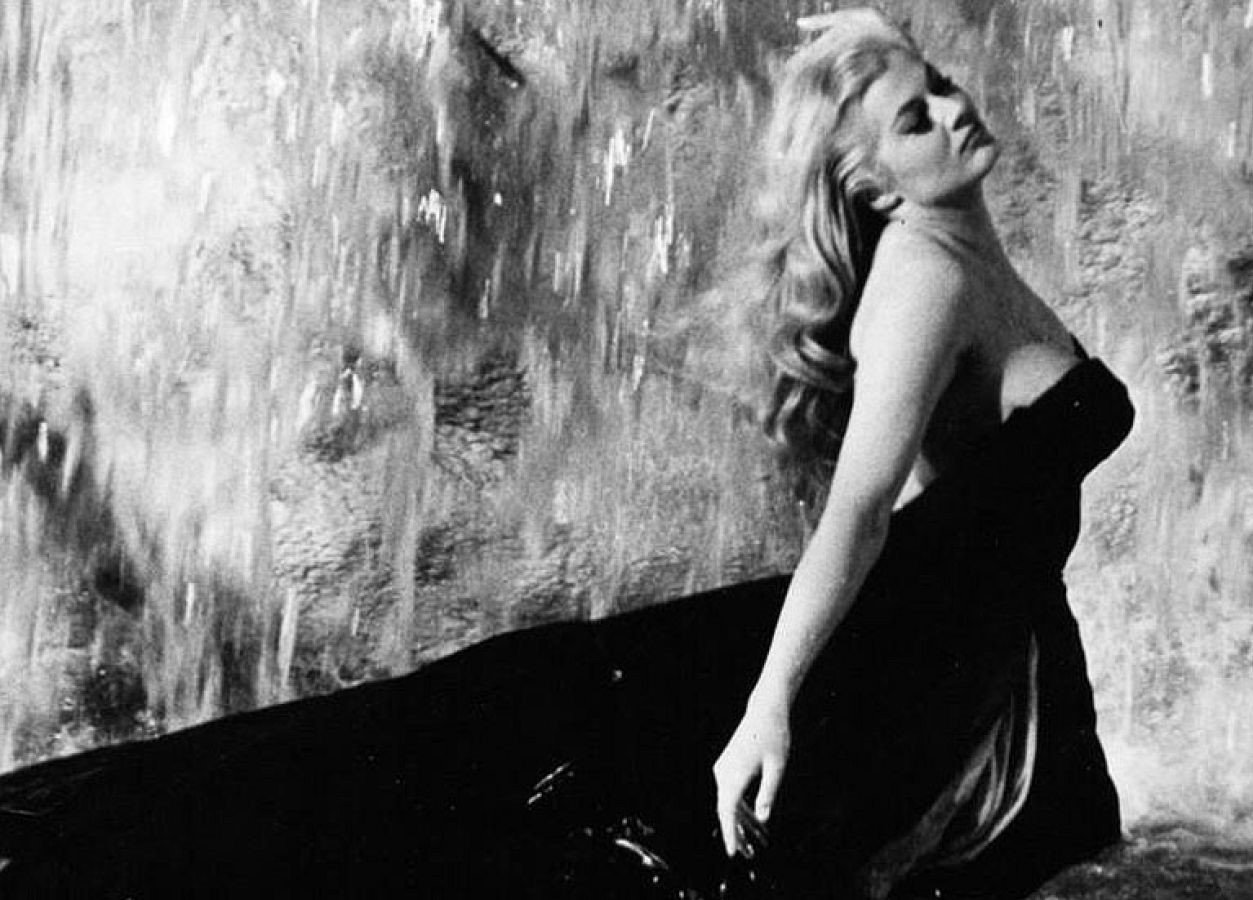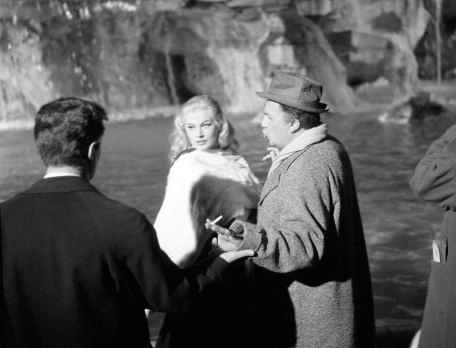 El rodaje de La dolce vita se inició el 16 de marzo de 1959 y aunque se prolongaría durante casi seis meses, las secuencias con Anita Ekberg se hicieron en las primeras jornadas debido a compromisos previamente adquiridos por la actriz. Durante la filmación -según nos informa el biógrafo Hollis Alpert- Fellini tuvo hacia Anita “una aproximación coqueta, le daba pequeños abrazos e insinuó una pasión hacia ella a la que no le podía dar una expresión real”. Y a aquellos que le preguntaban si se había acostado con ella durante la filmación Fellini les decía “Ustedes digan que sí”.
