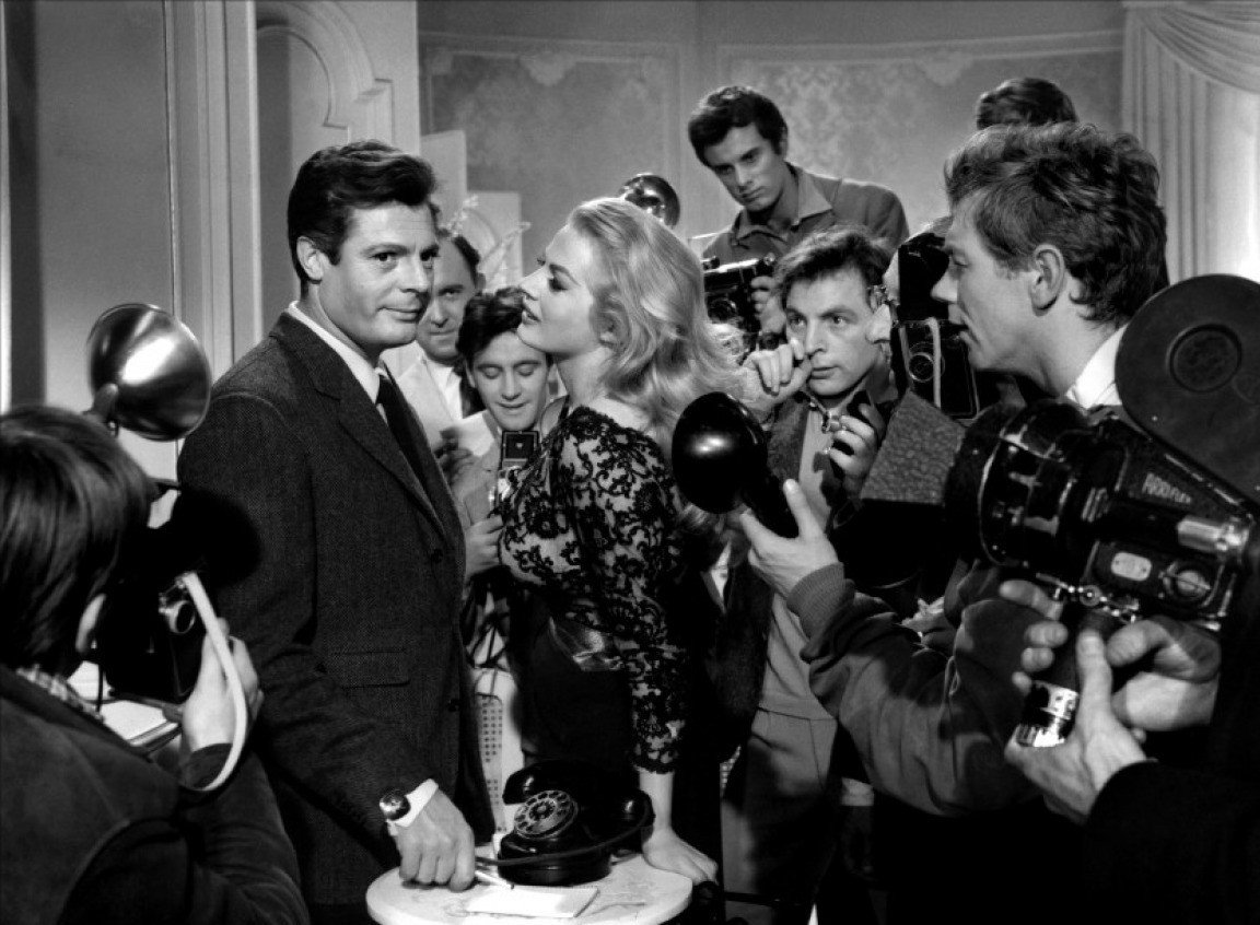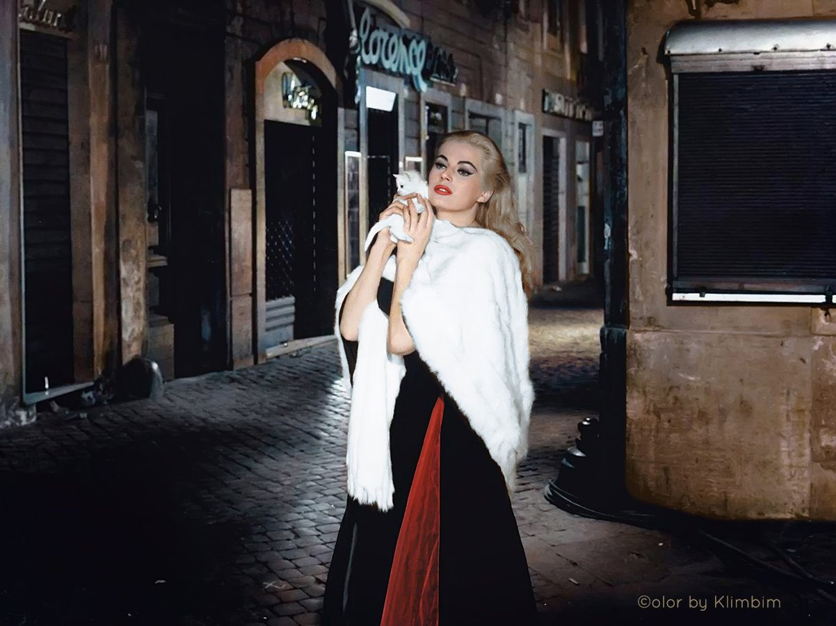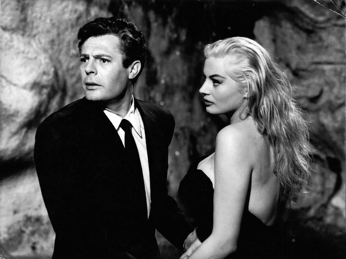 En la película Anita es Sylvia Rank y Mastroianni es Marcelo Rubini. Ella es una actriz norteamericana que llega a Roma a participar en un largometraje, él es un extenuado periodista de farándula. La diva es recibida con honores mediáticos en la ciudad, tanto en el aeropuerto como en la rueda de prensa que hace en su hotel. En ambos instantes Marcello está presente, pero indiferente ante la mujer. Solo se ve flechado por ella cuando la acompaña a subir por la cúpula de la basílica de San Pedro al día siguiente, mientras ella está ataviada con un ceñido disfraz de sacerdotisa. En la noche la acompaña a bailar al club Caracalla´s y ahí se muestra casi obsesionado por la belleza de esta mujer. “¡Eres la primera mujer del primer día de la creación. Eres la madre, la hermana, la amante, la amiga, el ángel, el diablo, la tierra, la casa! ¿Por qué has venido acá? ¡Vuelve a América, hazme el favor! ¿Entiendes? ¿Qué voy a hacer ahora?”, le dice Marcello. Ella lo mira y sonríe divertida. Bailará con otros y ante un desaire de su novio, se va acompañada de Marcello. La espera la noche romana, un gatito blanco, unos callejones solitarios y la Fontana di Trevi. La espera, sin saberlo, la inmortalidad.