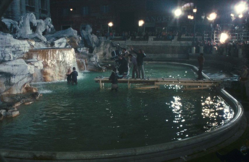 Una ambulancia del Hospital San Camilo retumba en la noche romana. Pretende pasar por el lado izquierdo de la Fontana di Trevi, pero unos andamios y un gentío se lo impiden. Están rodando una película en las aguas de esa fuente. –“¿De Sica?”- pregunta uno de los camilleros de la ambulancia. –“No. Fellini”, le responden. En el agua están los dobles de Anita Ekberg y Marcello Mastroianni, mientras el actor está sentado cerca al borde de la fuente flirteando con una aspirante a actriz y Anita está en sesión de maquillaje. Fellini coordina todo desde una cámara instalada sobre un riel encima de la fuente y se aprecian muchos curiosos asomados a ver la filmación de esta escena de La dolce vita que se volverá emblema de la película.