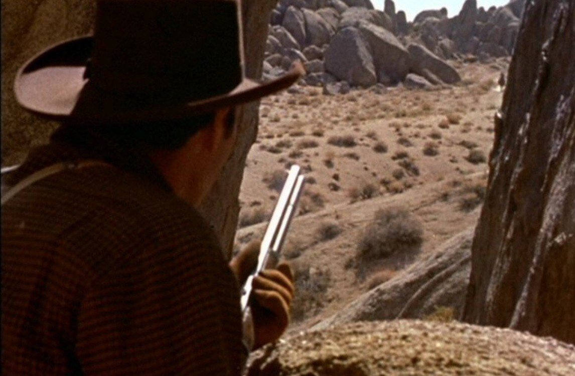 Que la carreta es el centro del drama lo confirma luego Masters cuando obligadamente abandona a los viajeros y se encamina hacia Flora Vista. Es la última media hora del filme y ya lo sabemos, quedan cinco bandoleros por dar de baja. Consecuente con la sencillez mostrada, Boenicher no quiere hacer grandes aspavientos. Es más, prefiere una confrontación final al aire libre, a campo abierto. No un duelo en las calles de un pueblo ajeno, sino una lucha con las rocas del camino como testigos. Tres años después, Alfred Hitchcock pondría a Cary Grant en medio de un enorme descampado para una de las secuencias de acción más famosas -avioneta de fumigación incluida- de Intriga internacional (North by Northwest, 1959), en una evocación imposible de no hacer al ver a Stride, acompañado de la carnada más tentadora posible, de pie en medio del desierto, esperando que lleguen a buscarlo los asesinos. Está solo, no tiene exactamente un plan, sólo sabe cuántos le quedan por liquidar. Caerán uno a uno, lo tenemos claro.