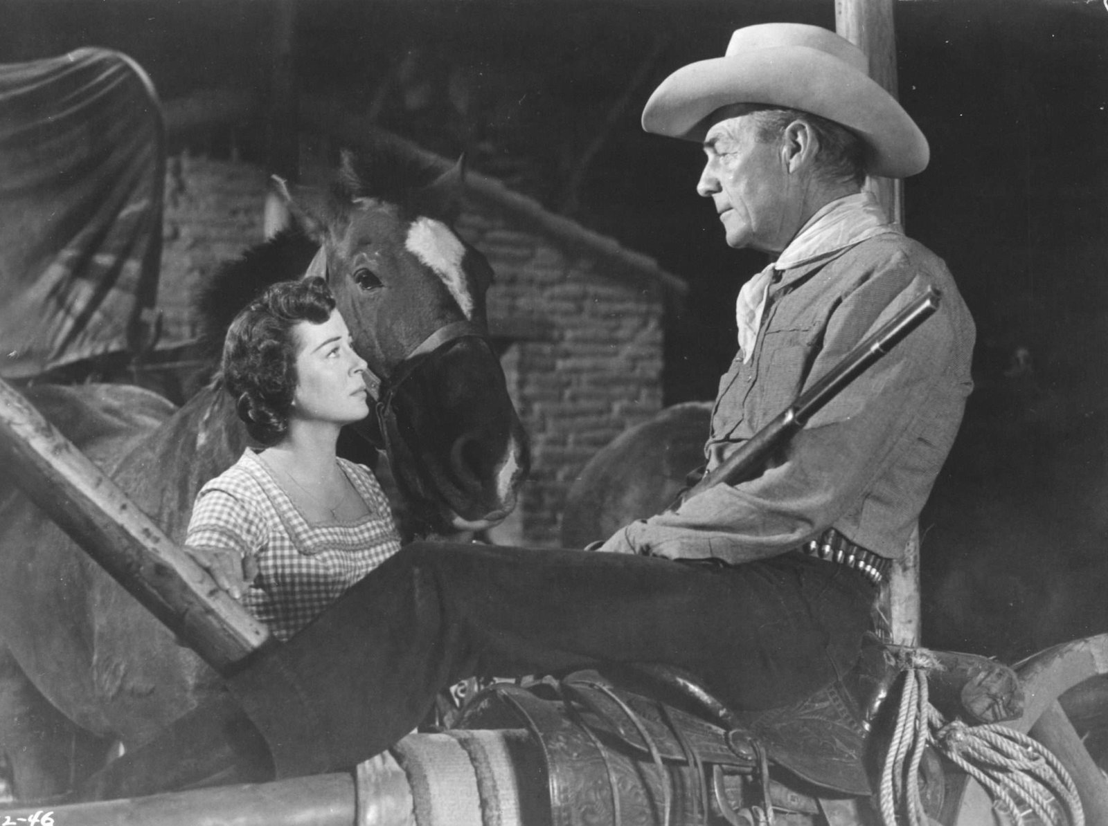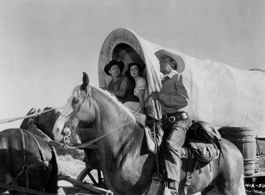 La película es el camino montañoso, rocoso, desértico que atraviesan. Vemos por primera vez el pueblo al que se dirigen cuando ya van cuarenta y cinco minutos del metraje, y aún faltan cinco asesinos por liquidar. Mientras, ha crecido entre los viajeros una curiosa tensión que se centra en Annie Greer (la bella Gail Russell), la mujer que con su esposo viaja en la carreta desde Kansas buscando establecerse en el Oeste. Ella se convierte sin saberlo en objeto de deseo, ante la debilidad y torpeza que muestra su marido. Stride la admira en silencio, mientras Masters (Lee Marvin) está dispuesto a lo que sea con tal de quedarse con sus afectos, así sea forzándola, así sea dejándola viuda. Esa carreta cubierta y sus dos habitantes representan el hogar, la pureza, el futuro, el progreso que Stride prometió defender y que ahora se ven amenazados por Masters y sus malas intenciones para con la mujer.