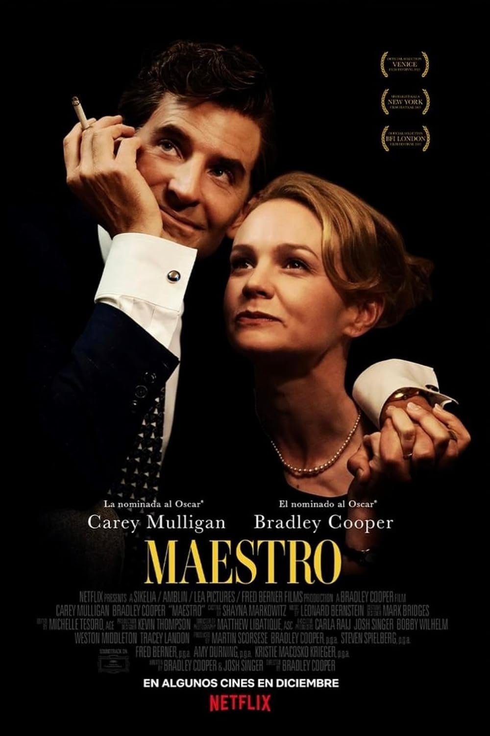 Así como a Bersntein le pesaba su condición sexual, también parecía sentir remordimiento por su vinculación a los musicales populares y al trabajo de composición de bandas sonoras –en la película se escuchan apartes de la música que escribió para On the Waterfront y West Side Story– como si eso le quitara pureza frente a su trabajo musical “culto” y no le sumara, en cambio, versatilidad. Entre esas dualidades se debatió siempre y lo mismo parece pasar en Maestro: ante la complejidad de la vida de este hombre, Bradley Cooper tenía que decidirse entre abordar su carrera musical o su vida amorosa. Optó por esta última –quizá la más jugosa comercialmente- y lo hizo con todos los poderosos elementos de la industria de Hollywood a los que tuvo acceso. Hizo una película consciente de que abordaba exclusivamente un ángulo y no el panorama completo, y de esto tenemos que tener claridad como espectadores. Este es su punto de vista y desde ahí Maestro cumple con las expectativas y nos entrega un producto comercial digno de admirar. Otra cosa es buscar lo que la película no es. Pero eso ya no depende de Bradley Cooper…