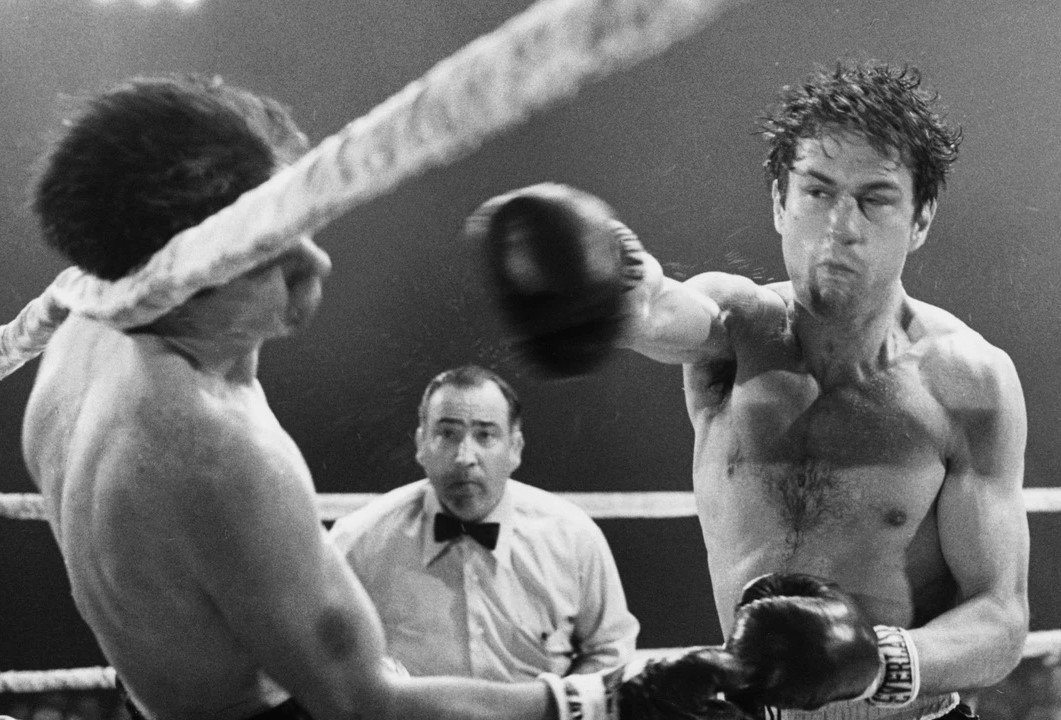 También Scorsese. Las secuencias de boxeo –que juntas no llegan a 15 minutos del metraje total del filme- están entre las más intensas jamás registradas por una película de ficción. Robert Rossen nos había mostrado décadas antes una aproximación en Body and Soul (1947), luego Stanley Kubrick lo intenta en la única secuencia de boxeo de El beso del asesino (Killer’s Kiss, 1955) y Robert Wise hizo lo propio en Somebody Up There Likes Me (1956). Aunque las secuencias de boxeo de las tres cintas están en su mayoría fotografiadas por detrás de las cuerdas del ring, por momentos la cámara se cuela al tinglado y vemos puntos de vista perceptuales, golpes dirigidos directamente a un espectador colocado en la posición del rival, contrapicados de ambos cuerpos trenzados y hasta lo que veríamos se fuéramos nosotros los que cayéramos a la lona, como ocurre con el protagonista de El beso del asesino. De igual manera las imágenes de Toro salvaje no tienen tampoco la distancia y objetividad de una transmisión televisiva de una pelea de boxeo: Scorsese quiere involucrarnos y por eso la película nos pone directamente junto a los boxeadores, en medio del ring, sintiendo que nos cae su sudor y su sangre en el rostro.