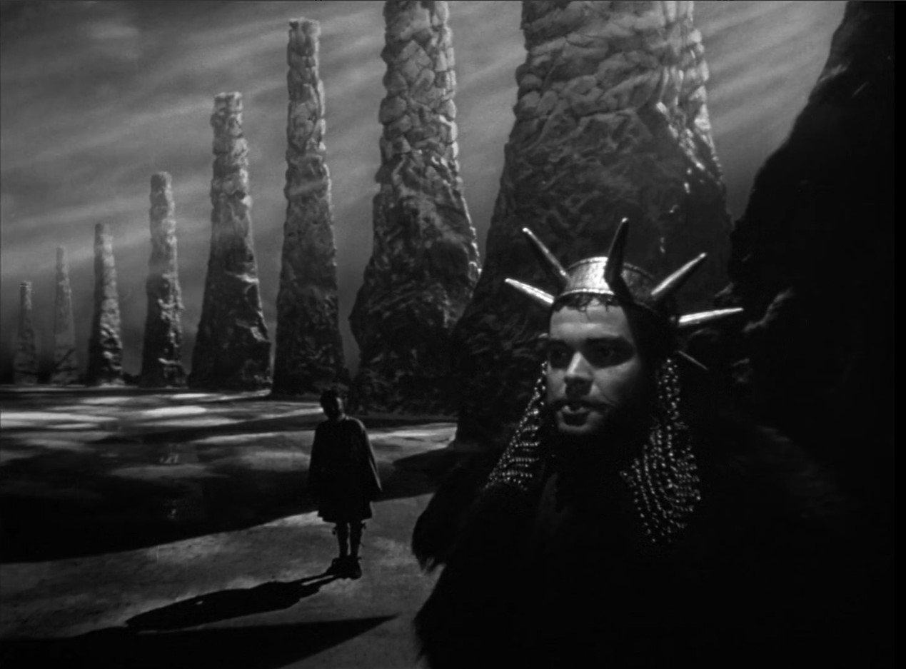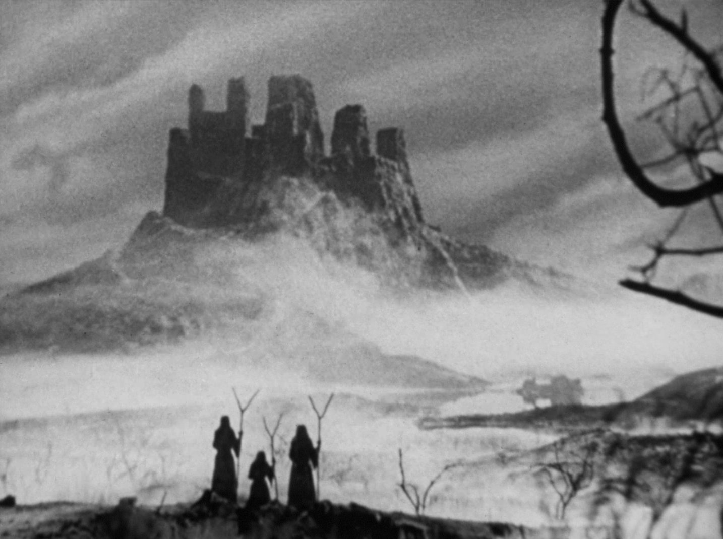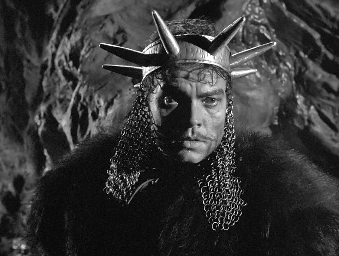 Esas imágenes son profundamente perturbadoras, por cierto. La Escocia del siglo XII se antoja, en manos de Welles, un lugar lóbrego que hiede a pestilencia y a muerte, donde la hechicería y los conjuros definen el destino de hombres y mujeres que parecen ser incapaces de ver en el otro algo diferente a aliados o a enemigos. No saben para qué quieren un poder que inexorablemente va a ser arrancado rápidamente por otro más fuerte o más inescrupuloso. Es una época bárbara, donde los reyes tienen sus aposentos en cavernas excavadas o arrancadas a las rocas, y donde las fortalezas que habitan son austeros laberintos de piedra sin más adorno que un portón metálico fuertemente cerrado. La noche es eternamente larga en esa Escocia sin sosiego, un infierno vacilante donde todos son traidores, cobardes, taimados y ambiciosos; donde todos parecen tener manchadas de sangre las manos. Es el brebaje perfecto para que las brujas inciten la codicia de un noble, Macbeth (el propio Orson Welles), y lo hagan suponer que el destino le tiene reservada la corona del reino, así tenga que abrirse camino violentamente hacia ella.
