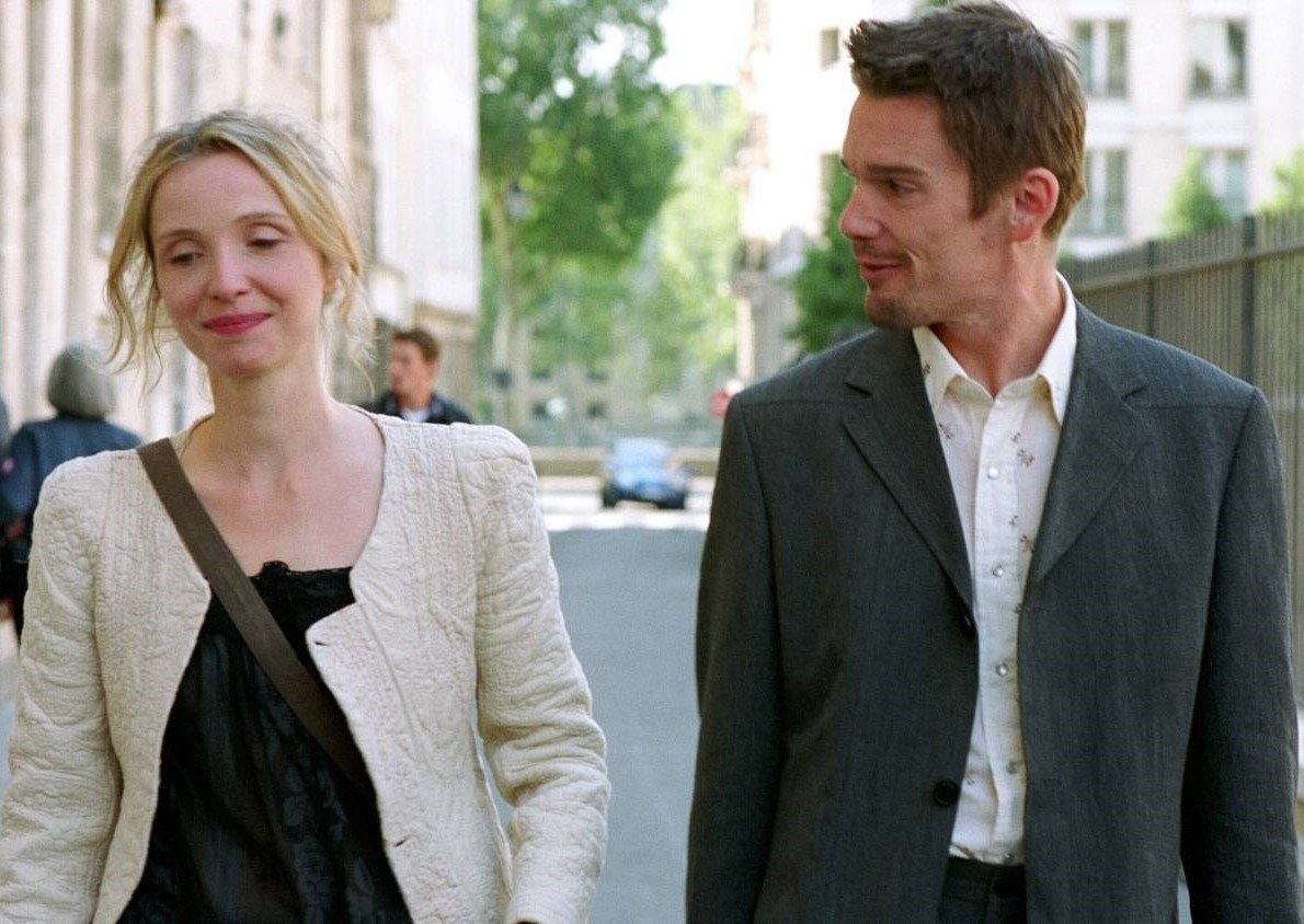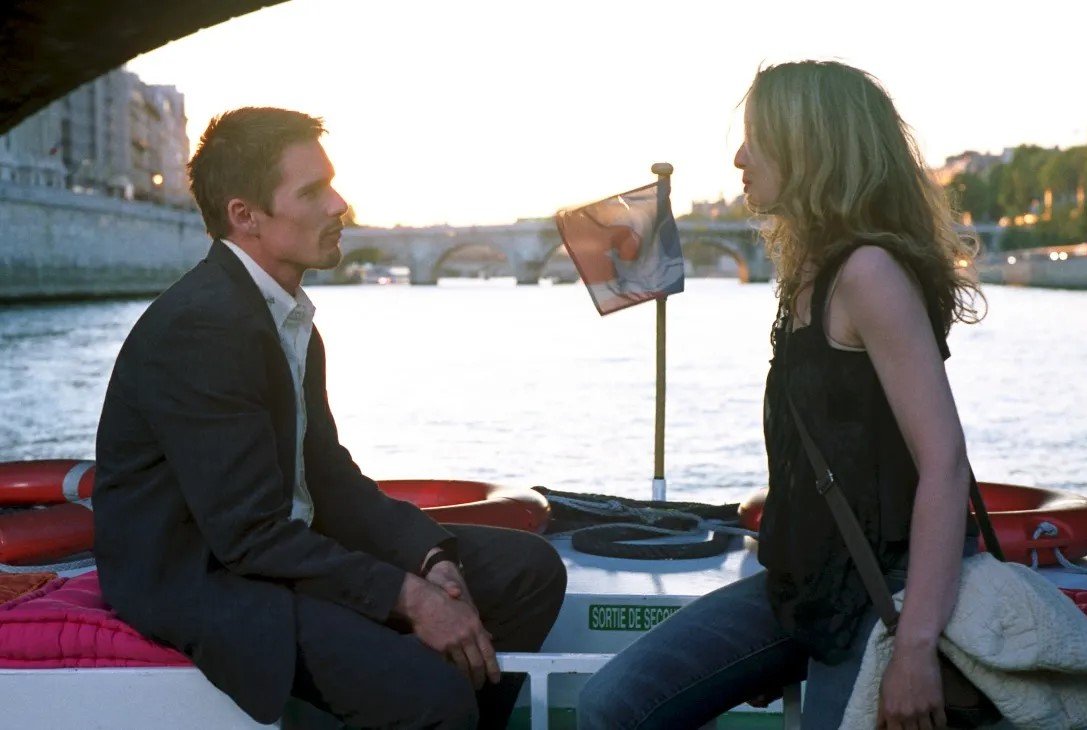 Han vuelto a verse. La gran duda del final abierto de Antes del amanecer (Before Sunrise, 1995) era si Jesse y Celine se habían reencontrado, tal como lo habían prometido al final del filme. Y así ocurrió. Pero no pasó tan pronto como ellos y nosotros esperábamos. Tendrían que transcurrir nueve años para que volvieran a verse, para que volviéramos a verlos. La cita no fue esta vez fruto de un encuentro casual. Jesse había escrito un libro en el que hacía ficción su fugaz encuentro con Celine en Viena, a la manera de un anzuelo que le sirviera para atraerla de nuevo. Ahora estaba en París presentando el texto y -quizá- tratando de encontrar a Celine, y lo logró. Ella acudió a la cita tácita en la librería Shakespeare & Co, pero no tienen tiempo. A él le queda un poco más de una hora para tomar el vuelo a Nueva York. Eso es todo lo que tienen para resumir lo que ha sido de sus vidas en estos nueve años. Un rato, Antes del atardecer (Before Sunset, 2004).