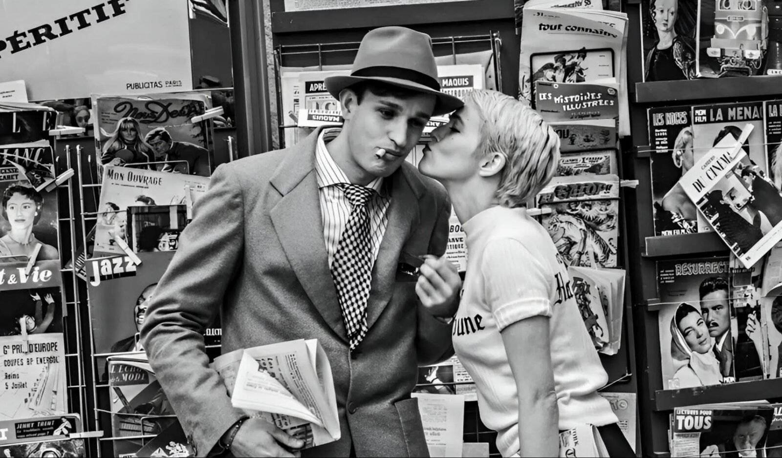 Para explicar esto hay que irse al rodaje real de Sin aliento (aunque esto también lo reproduce Nouvelle Vague): Richard Balducci, el publicista a cargo de la película, hizo que Marc Pierret, un periodista de France-Observateur, llevara un diario de rodaje mientras hacía las veces —con la anuencia de Godard— de falso asistente de producción. Él describe en el reportaje resultante a un Godard solitario, delineando una escena mientras come, casi a la medianoche, un plato de crudités en la pizzería St. Germain, en el barrio Latino. Dispersos alrededor de la mesa hay papeles, hojas, notas. Según nos cuenta Richard Brody en su magnífica biografía de Godard, Everything Is Cinema, esos papeles “incluían muchas citas de fuentes literarias que Godard había seleccionado en sus lecturas obsesivas y que liberalmente salpicó a lo largo de los parlamentos del filme”. Los parlamentos de Sin aliento, al no contar con un guion convencional estructurado, son una colcha de retazos de citas ajenas de las que Godard se apropia, lo que provoca la desilusión y el desconcierto de sus dos protagonistas, Jean-Paul Belmondo (Aubry Dullin) y Jean Seberg (Zoey Deutch).