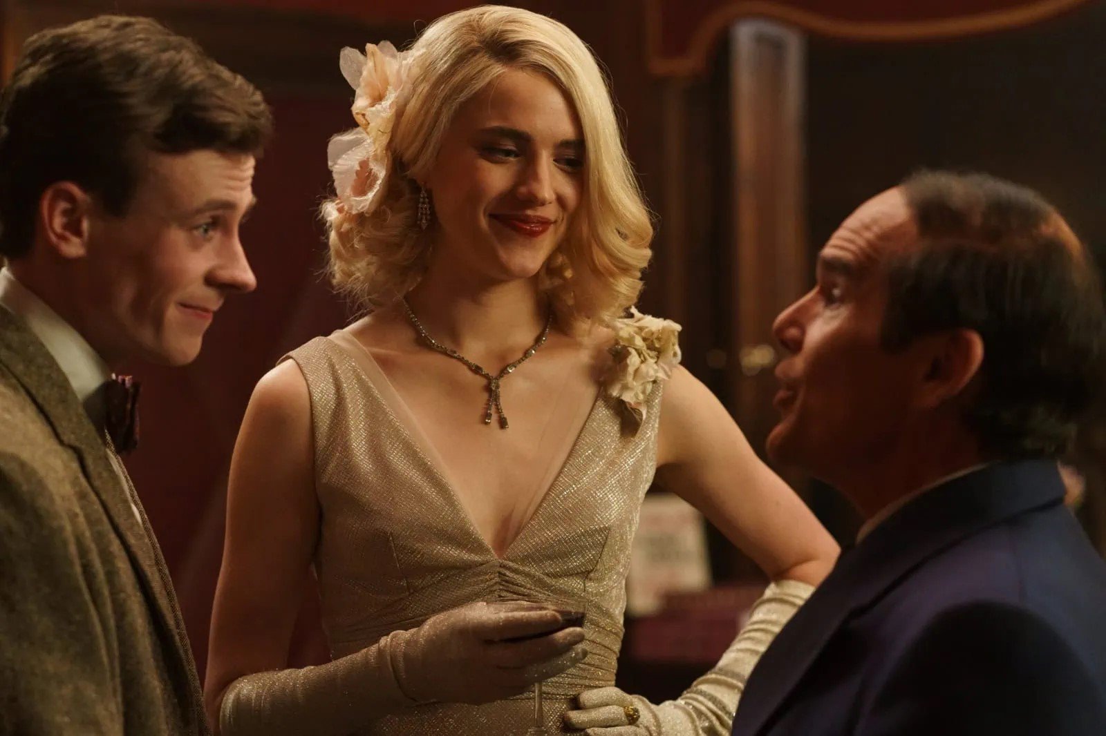 La película se vuelve más íntima cuando aparece Elizabeth Weiland (Margaret Qualley), a quien Hart conoció en los ensayos de Por Júpiter. Universitaria veinteañera, segundo año de Bellas Artes en Yale, es para él “mi irremplazable Elizabeth”, como la llama en sus cartas. La correspondencia entre ambos —citada por sus biógrafos— revela a un Hart profundamente dependiente de ese vínculo: misivas extensas, teatrales, llenas de halagos y una necesidad constante de atención, frente a las respuestas más breves, afectuosas pero distantes, de Elizabeth. El guion de Robert Kaplow, inspirado directamente en ese intercambio epistolar, construye una tragedia romántica no correspondida: ella le cuenta con naturalidad sus amoríos y aventuras sexuales con chicos de su edad; para Elizabeth, Hart es un amigo, un confidente, nunca una posibilidad amorosa real. Margaret Qualley le da al personaje un tono absolutamente contemporáneo, una energía juvenil que contrasta con lo pusilánime de Hart, con su tendencia a compadecerse de sí mismo, sobre todo cuando se compara con los amantes jóvenes y despreocupados de ella.