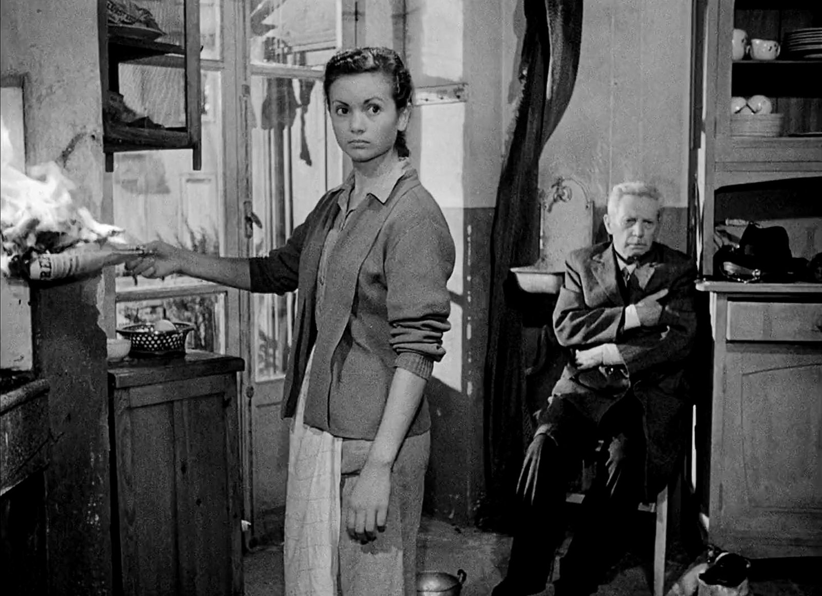 Para conseguir eso Umberto D. está filmada, en varios momentos, prácticamente en tiempo real, sin elipsis alguna que nos evite ser testigos del proceso activo de elaboración mental de los protagonistas. Dos secuencias registradas en este filme por el cinematografista Aldo Graziati son especialmente paradigmáticas de esto. Una de ellas -de cuatro minutos de duración- es uno de los momentos más bellos y sensibles que el cine recuerde: María (interpretada por Maria Pia Casilio) la empleada doméstica, se despierta al oír a Umberto hablando por teléfono. Ya la mañana está por empezar, hay un gato que camina sobre el techo y ella se levanta con indudable sueño. Se despereza con dificultad, se pone de pie, calienta agua, mira por la ventana donde ve otro gato. Y piensa. Piensa en ese hijo sin padre definido, piensa en ella. Y una lágrima incapaz de ser contenida reluce en su rostro. Ahora se sienta a moler café y sigue pensando. Vuelve a llorar. Sentada empieza a estirar una pierna para cerrar la puerta de la cocina con la punta de los dedos, feliz de haber sido capaz de lograrlo.