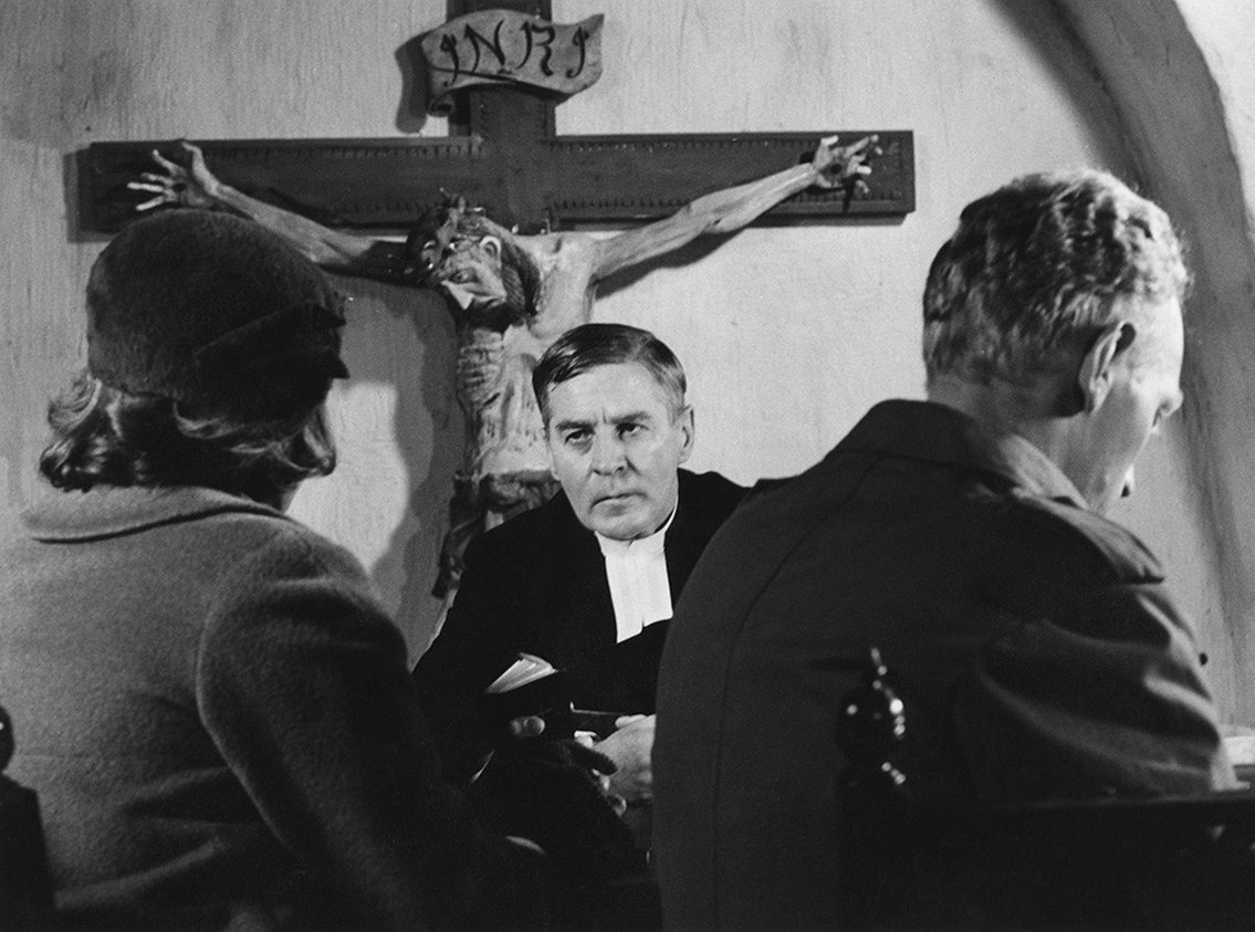 Esa incapacidad para darse al otro se pone a prueba cuando lo visita una pareja de pescadores, Jonas y Karin Persson (nada menos que Max von Sydow y Gunnel Lindblom), preocupados por la desesperanza depresiva de Jonas, que en plena guerra fría (la película se rodó durante 56 días a mediados de 1962), teme al holocausto nuclear. La conversación inútil y torpe entre el pastor y el feligrés desnuda la imposibilidad de Tomas para interesarse en los miedos ajenos, en el alma acongojada del otro. Su perorata sobre la inexistencia de Dios y como eso representa que la muerte es una extinción y no un inicio, puede que lo libere a él, pero asusta a Jonas, que sale aterrado de la sacristía. Las consecuencias de ese encuentro son tan demoledoras como poco trascendentales para el pastor, vaciado de cualquier sentimiento de compasión hacia el prójimo.