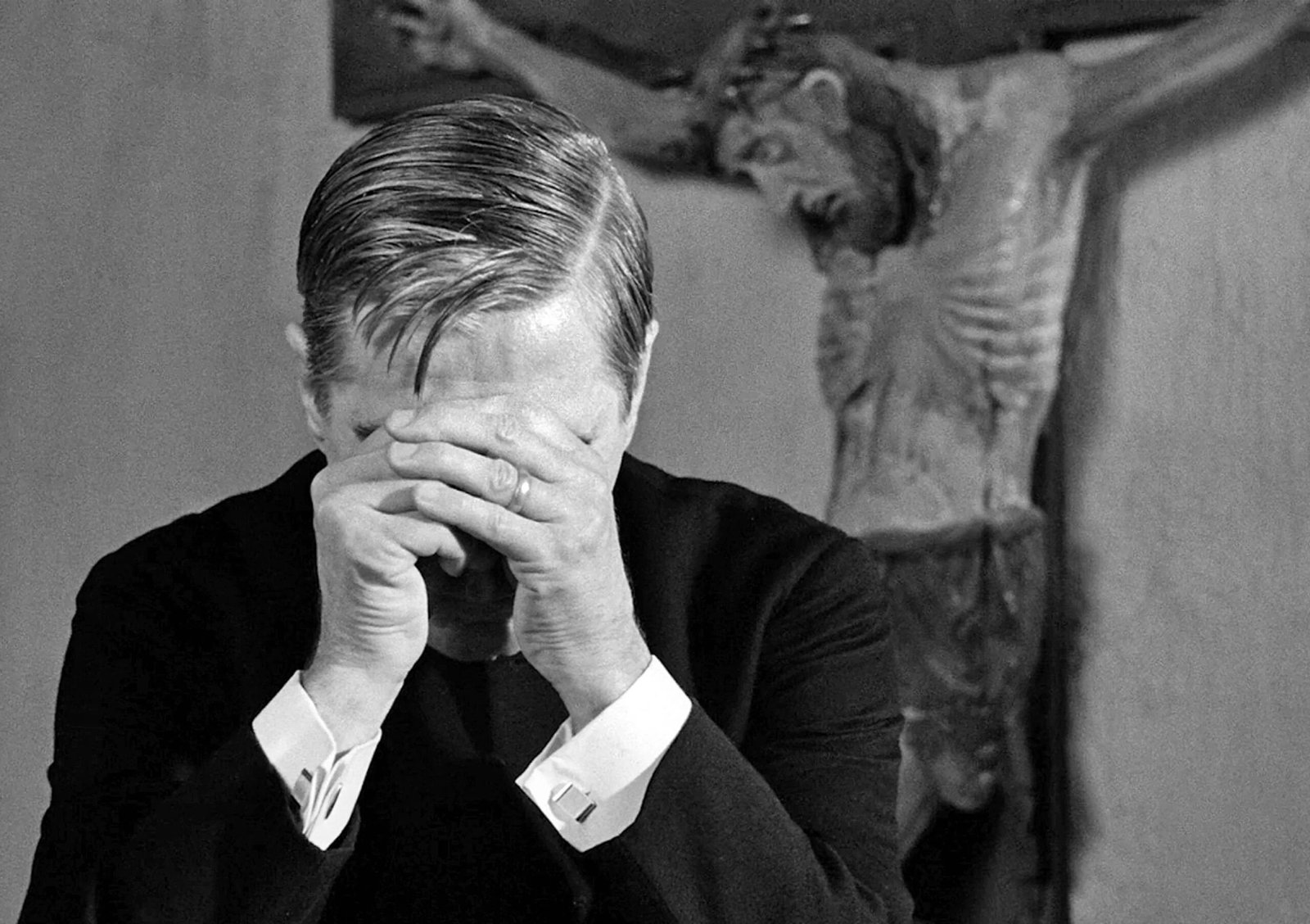 Hijo de un estricto pastor luterano, Bergman quiso hacer de un pastor el centro de este relato ascético que transcurre entre el mediodía y las 3:00 pm de un domingo de invierno, y que empieza y termina en una celebración eucarística. Según el director, el drama del filme surgió inspirándose al escuchar el viernes santo de 1961 la Sinfonía de los salmos, de Stravinski. En Luz de invierno conoceremos al pastor Tomas Ericsson (el gran Gunnar Björnstrand, en un rol que detestó), concluyendo un rito que él hace mecánicamente, sin introspección, sin sensibilidad ni pasión alguna. A lo largo del metraje del filme él tendrá tres conversaciones, tres momentos –tres movimientos, aludiendo a la sinfonía mencionada- en los que cansado y enfermo, decide liberar sus sentimientos y manifestar su profunda desolación. Tomas ha dejado de creer. Tras su ordenación fue enviado a Portugal durante la Guerra Civil Española y presenció actos que lo aterraron y que no se compadecían con la bondad de un Dios idealista que era para él fuente de esperanza y consuelo. Posteriormente falleció su esposa, y en los cuatro años que han pasado de ese suceso, su fe se acabó de destrozar, reemplazada por una decepción espiritual que lo tiene muerto en vida, incapaz de sentir empatía, de dar consuelo, de brindar amor. En su libro Imágenes, Ingmar Bergman afirma de ese personaje que “Existe más allá del amor, en realidad más allá de toda relación humana. Su infierno, porque realmente vive en el infierno, es que es consciente de su situación” (1).